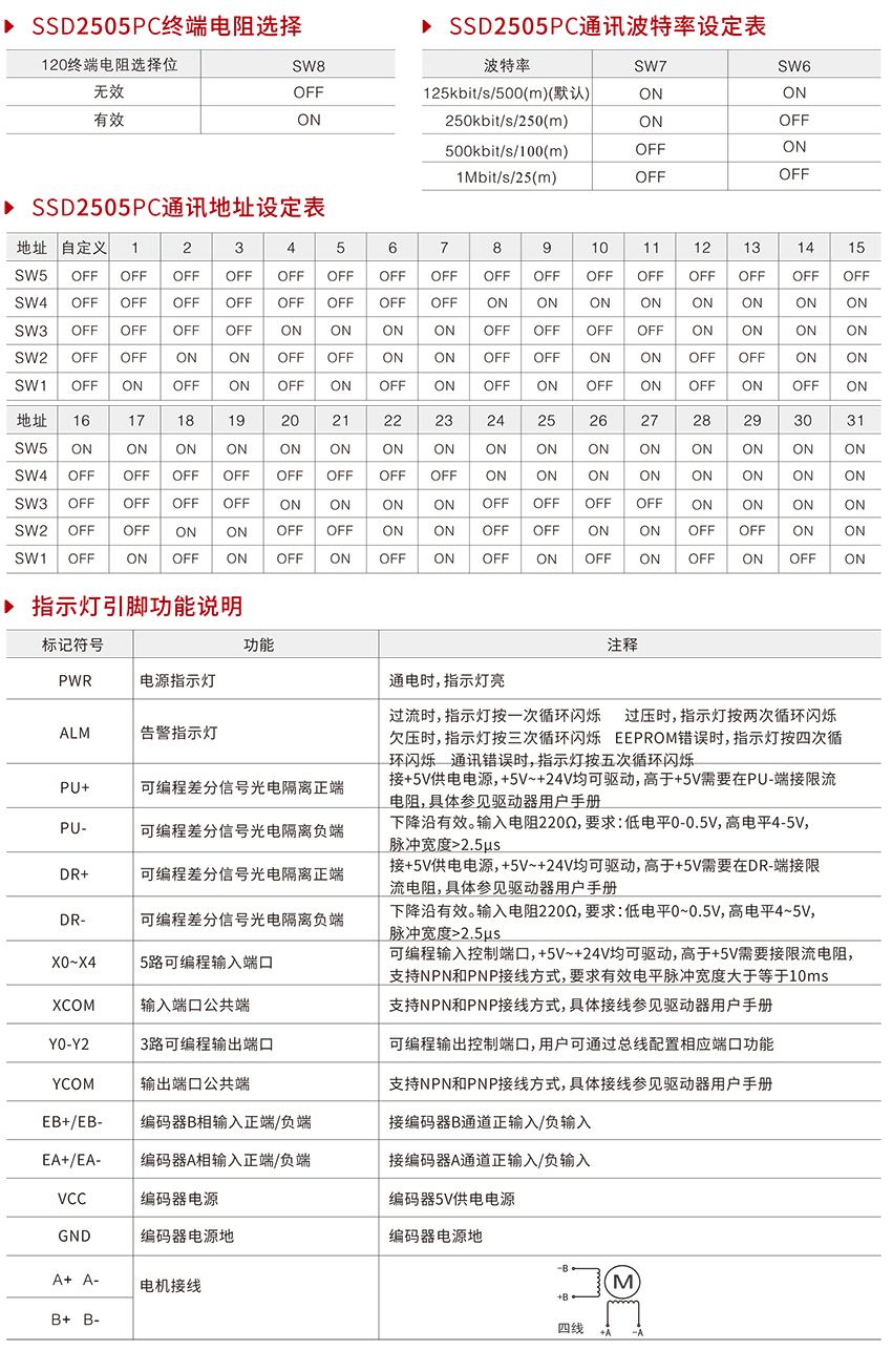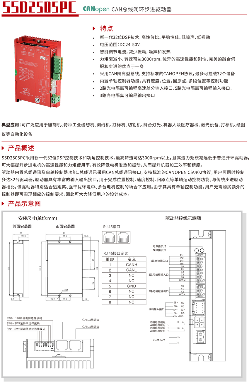 驅(qū)動器內(nèi)置總線通訊及單軸控制器功能。總線通訊采用CAN總線通訊接口,支持標(biāo)準(zhǔn)的CANOPEN CiA402協(xié)議,用戶可同時(shí)控制多達(dá)32臺驅(qū)動器,同時(shí),驅(qū)動器具有豐富的輸入輸出接口,用于完成位置控制,速度控制,回原點(diǎn)等單軸運(yùn)動控制功能。與傳統(tǒng)步進(jìn)驅(qū)動器相比,該驅(qū)動器特別適合遠(yuǎn)距離、強(qiáng)干擾環(huán)境中、多臺電機(jī)控制的場合下應(yīng)用。由于其具有單軸控制功能,用戶可則無需購買額外的控制器即可實(shí)現(xiàn)相應(yīng)的控制要求,因此可大大降低用戶的設(shè)計(jì)成本。