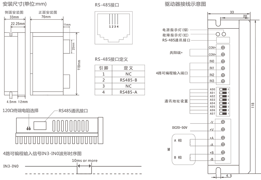該驅(qū)動(dòng)器在功能上可以完全替代傳統(tǒng)脈沖加方向控制的步進(jìn)驅(qū)動(dòng)器。驅(qū)動(dòng)器內(nèi)置總線通訊功能,采用RS-485總線,用戶