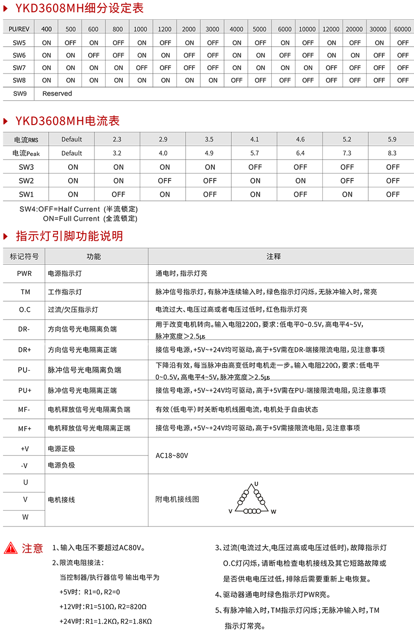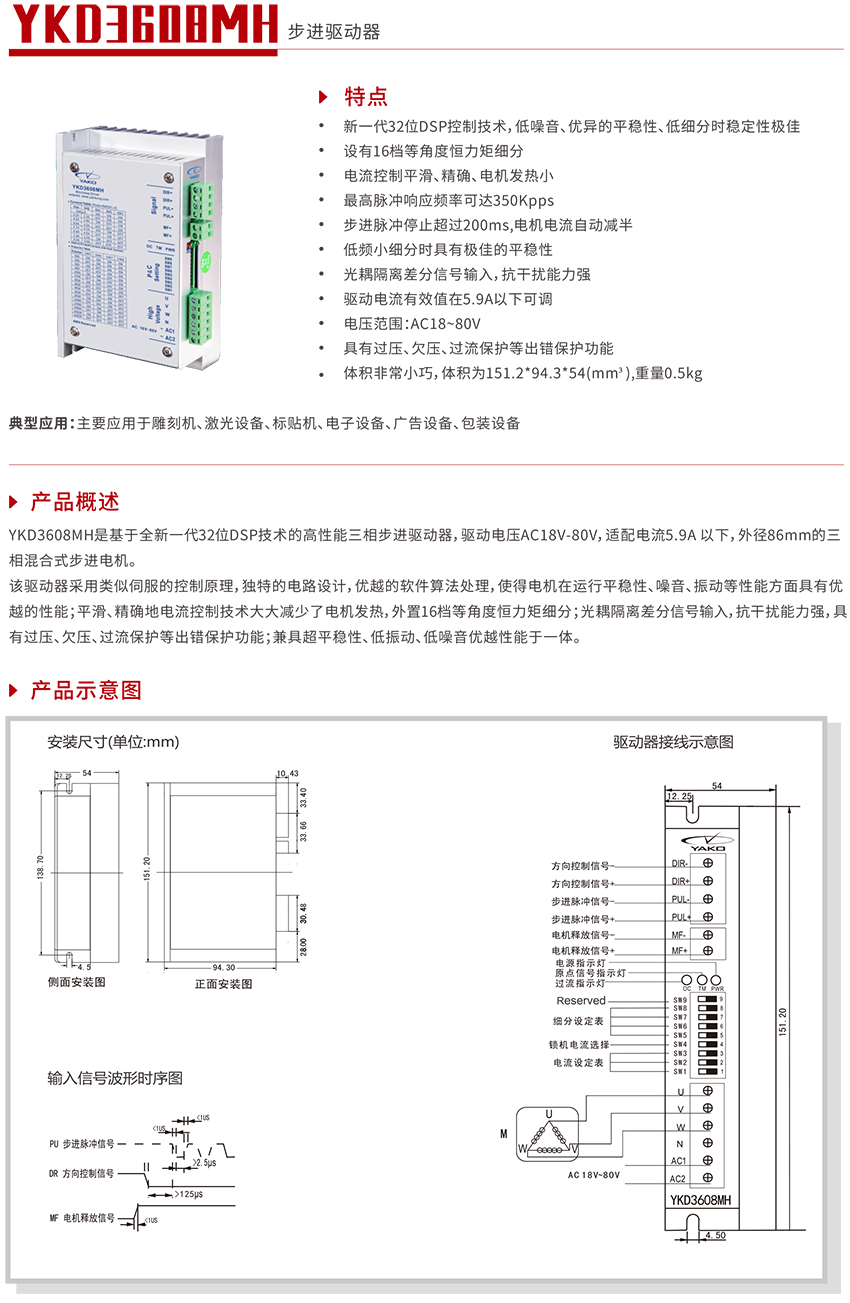 YKD3608MH是基于全新一代32位DSP技術(shù)的高性能三相數(shù)字式步進(jìn)驅(qū)動器,驅(qū)動電壓AC18V-80V,適配電流5.9A 以下,外徑57~86mm的各種型號的三相混合式步進(jìn)電機(jī)。
